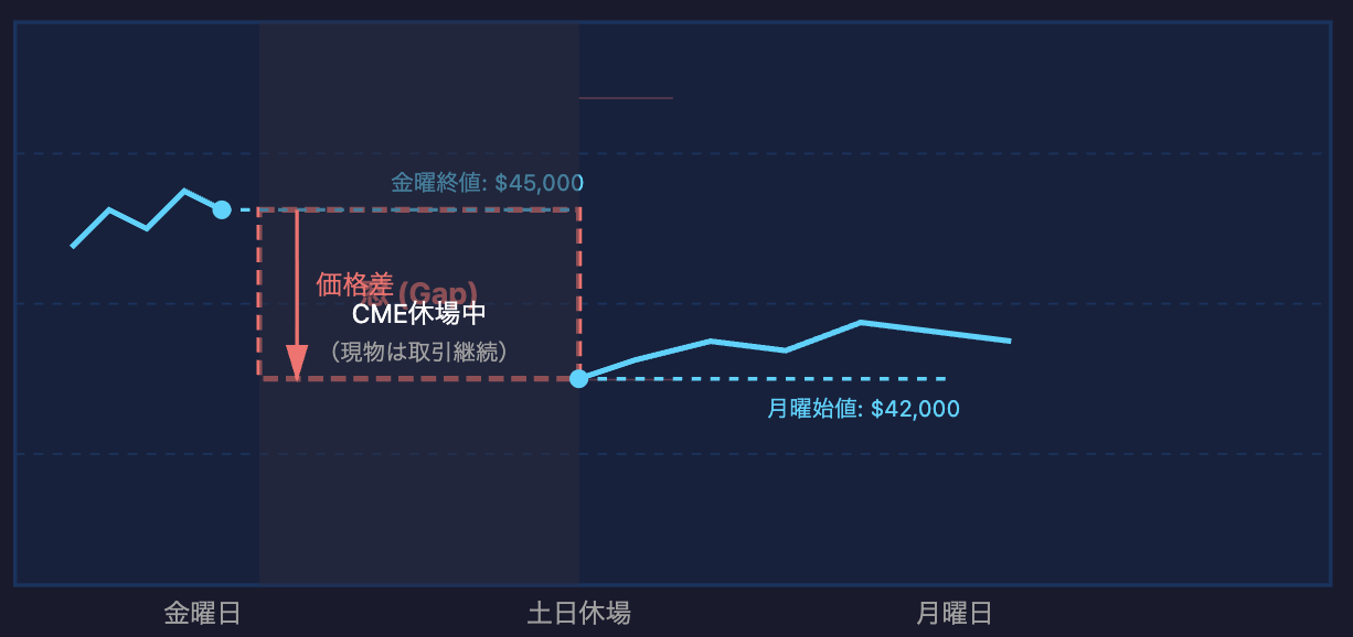 CMEの窓とは、**CMEのビットコイン先物市場で週末の取引停止中に開く価格の空白(ギャップ)**のことを指します。